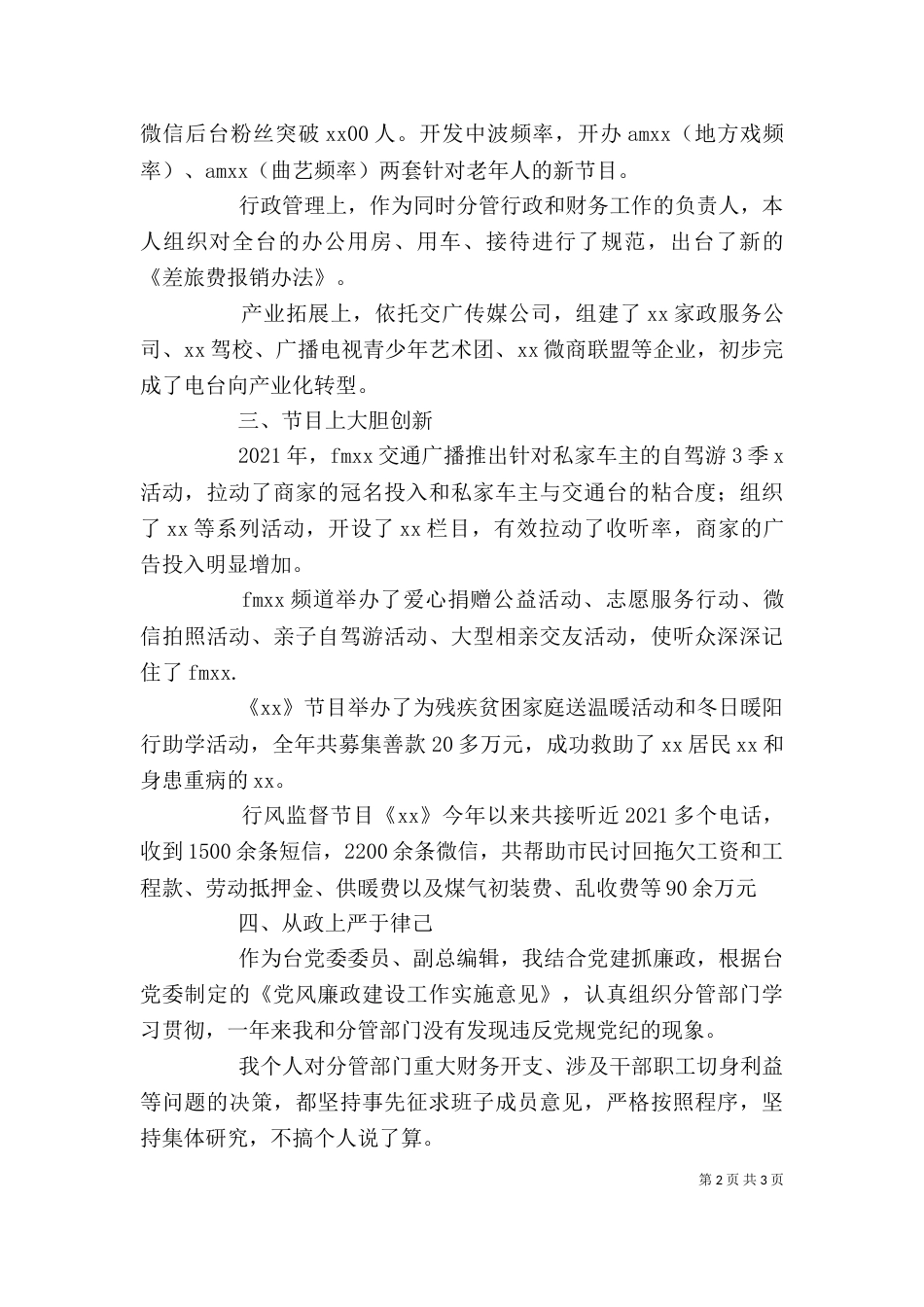 第1页共3页电台副总编辑2021年个人述职述廉报告2021年电台在台党委的正确领导和支持下,各项工作取得明显成效。现将一年来的工作和廉洁从政...