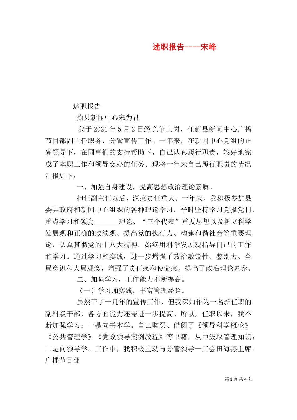 第1页共4页述职报告----宋峰述职报告蓟县新闻中心宋为君我于2021年5月2日经竞争上岗,任蓟县新闻中心广播节目部副主任职务,分管宣传工作。...