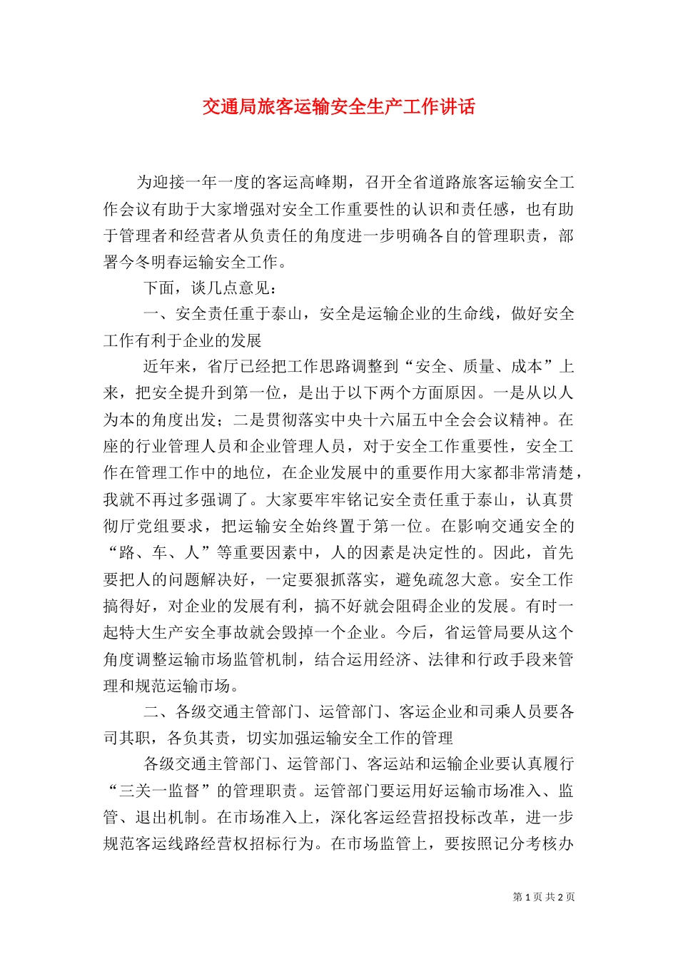 第1页共2页书山有路勤为径,学海无涯苦作舟。交通局旅客运输安全生产工作讲话为迎接一年一度的客运高峰期,召开全省道路旅客运输安全工作会...