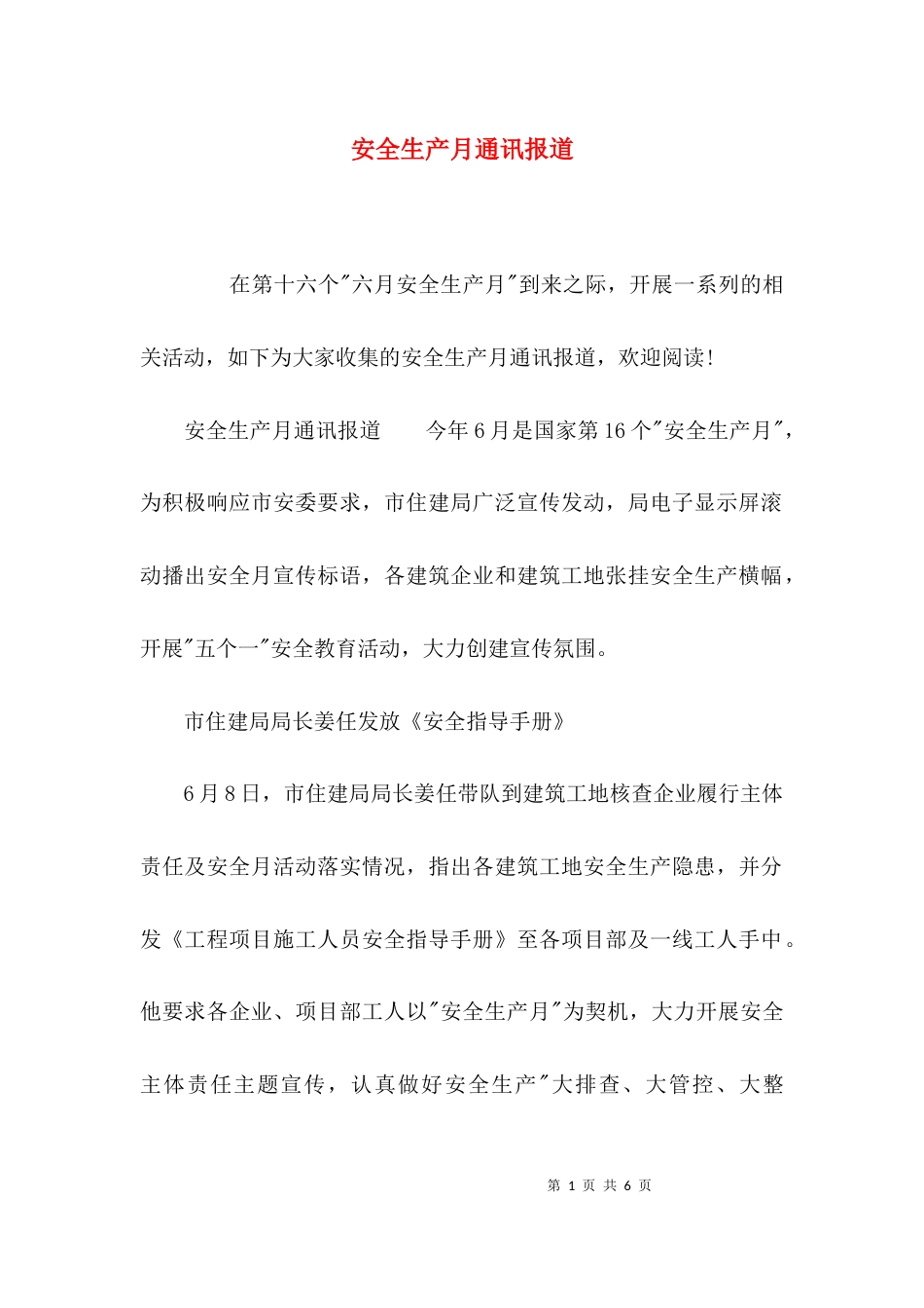第1页共6页安全生产月通讯报道在第十六个"六月安全生产月"到来之际,开展一系列的相关活动,如下为大家收集的安全生产月通讯报道,欢迎阅读...