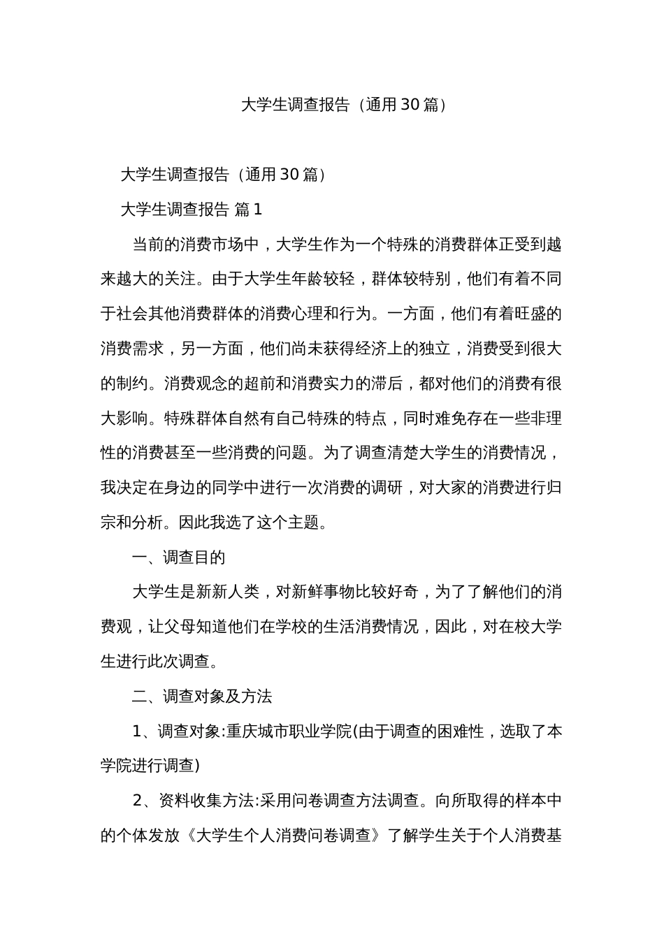 大学生调查报告(通用30篇)大学生调查报告(通用30篇)大学生调查报告篇1当前的消费市场中,大学生作为一个特殊的消费群体正受到越来越大...