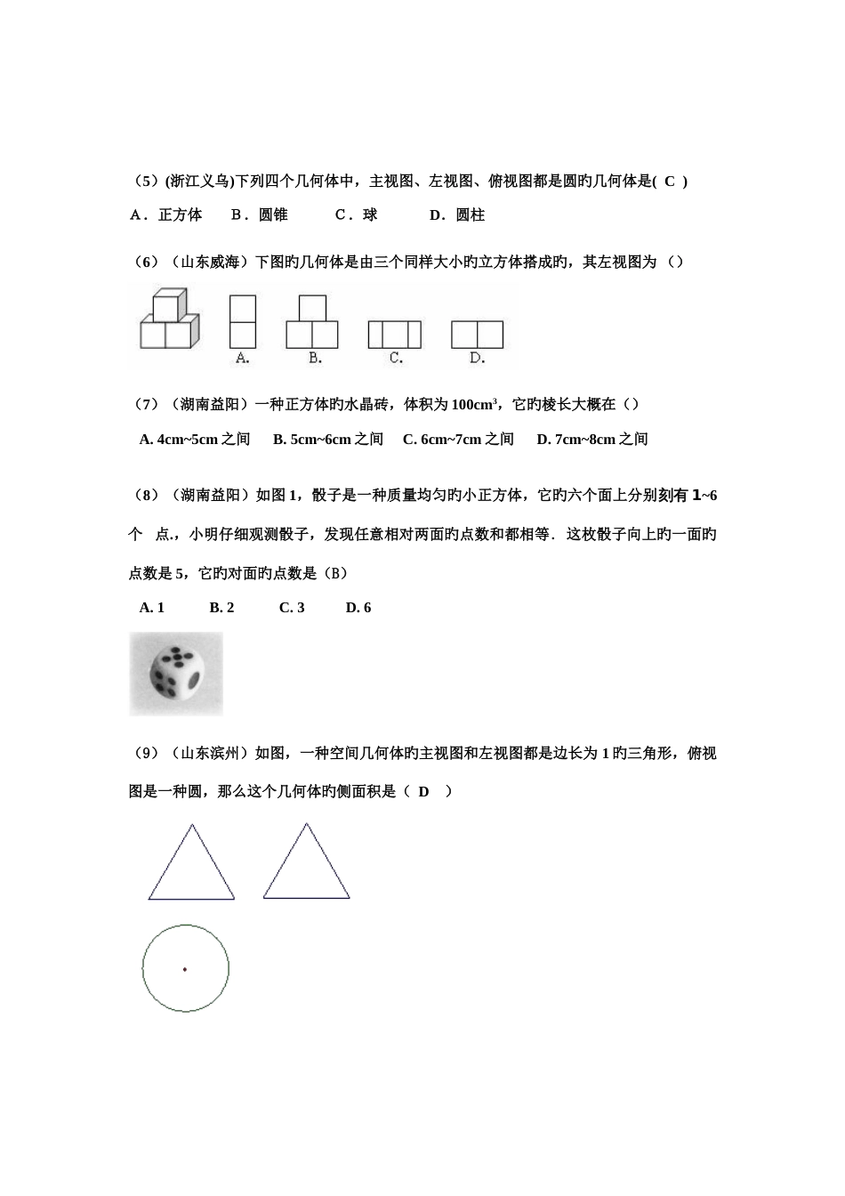 知识点:三视图,展开图(1)(四川宜宾)下面几何旳主视图是(B)(2)(浙江衢州)下面形状旳四张纸板,按图中线通过折叠可以围成一下直三...