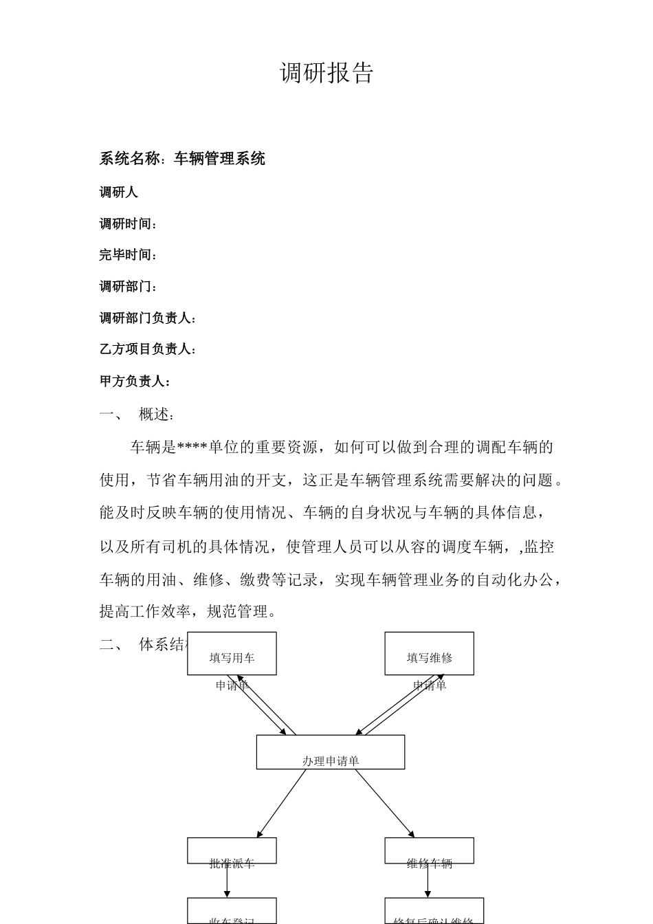 调研报告系统名称:车辆管理系统调研人调研时间:完毕时间:调研部门:调研部门负责人:乙方项目负责人:甲方负责人:一、概述:车辆是****...