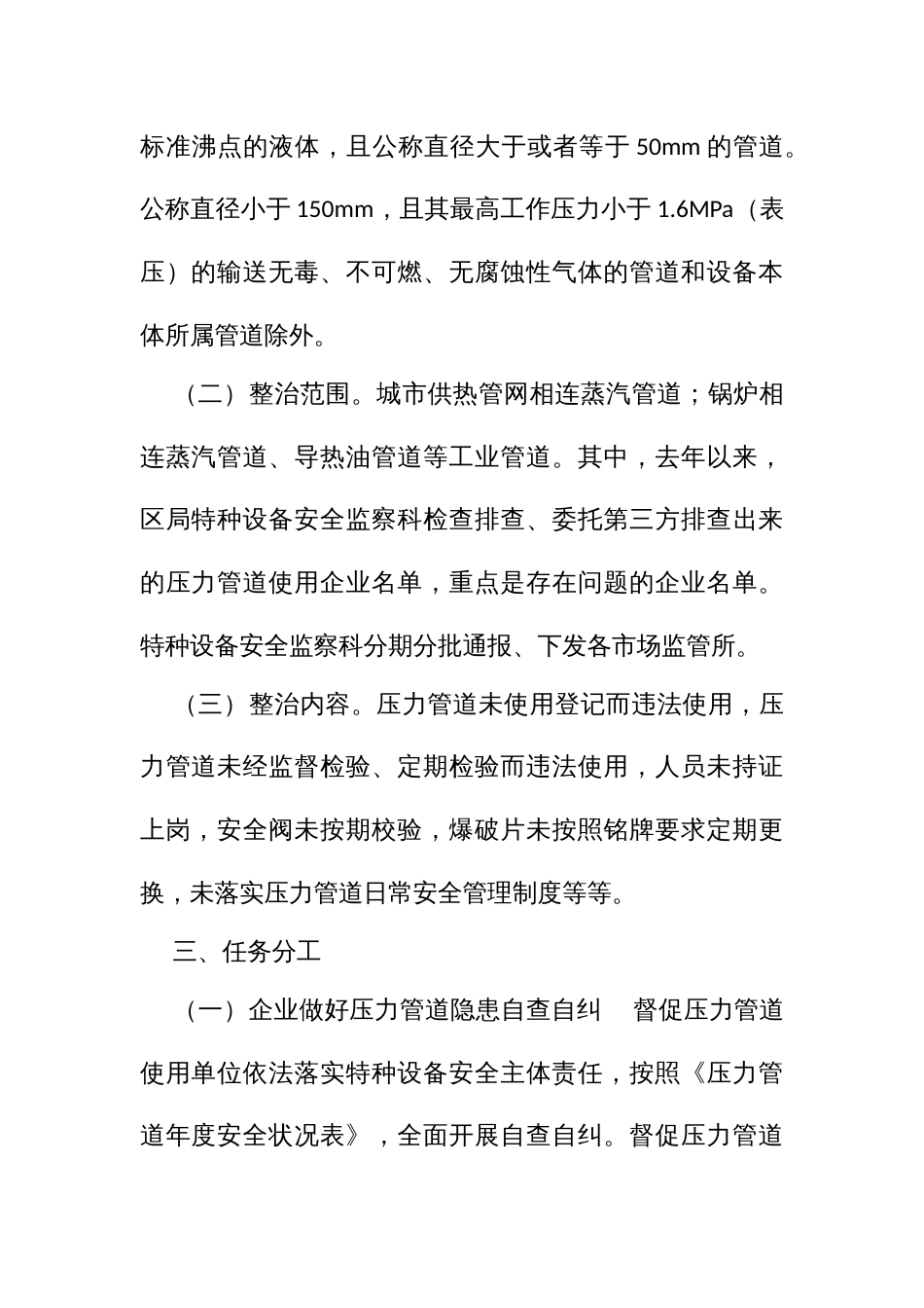 压力管道隐患整治方案为贯彻落实上级政府压力管道整治的工作部署,防范区域性、系统性风险,根据**,结合我区实际,现制定本方案:一、整治...