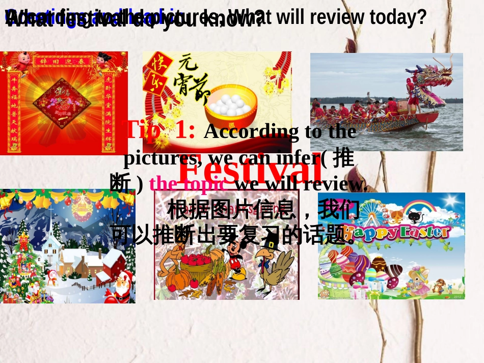 Topic3Let'scelebrate!仁爱七下FestivalGreetingsandlead-inTip1:Accordingtothepictures,wecaninfer(推断)thetopicwewillreview.根据图片...