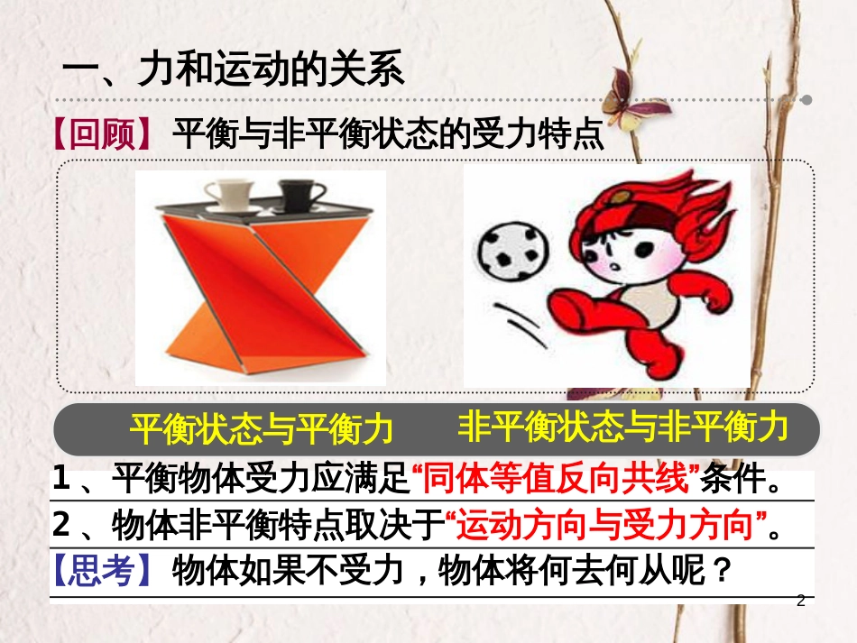 1平衡状态与平衡力一、力和运动的关系【回顾】平衡与非平衡状态的受力特点1、平衡物体受力应满足“同体等值反向共线”条件。2、物体非平衡...
