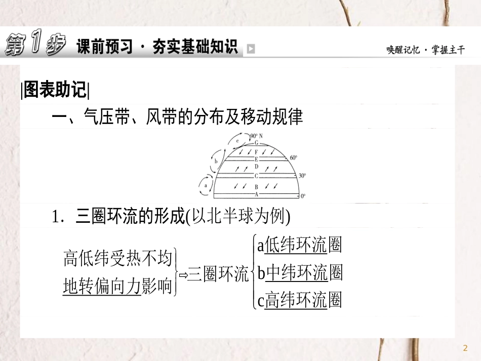 1|图表助记|一、气压带、风带的分布及移动规律1.三圈环流的形成(以北半球为例)高低纬受热不均地转偏向力影响⇨三圈环流...