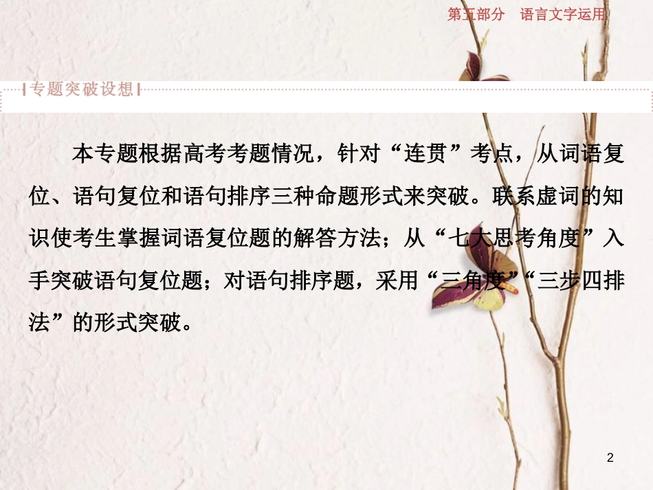 2019高考语文一轮总复习 第五部分 语言文字运用 6 专题五 语言表达的连贯(句子的衔接)课件_第2页