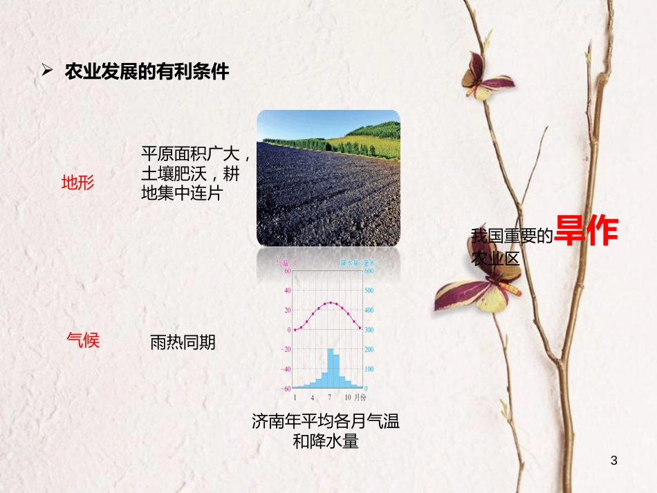 北方地区的农业生产12农业发展的有利条件地形平原面积广大,土壤肥沃,耕地集中连片气候雨热同期我国重要的旱作农业区济南年平均各月气温...