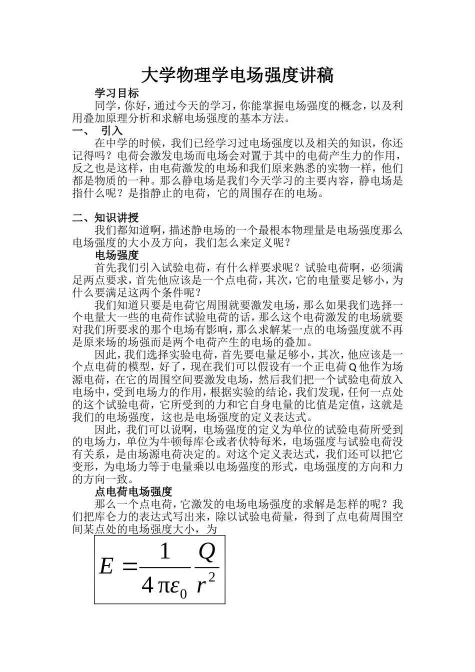 大学物理学电场强度讲稿学习目标同学,你好,通过今天的学习,你能掌握电场强度的概念,以及利用叠加原理分析和求解电场强度的基本方法。一...