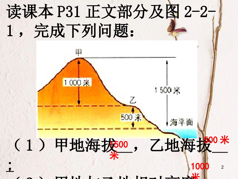 第二章地图第二节地形图的判读1读课本P31正文部分及图2-2-1,完成下列问题:(1)甲地海拔,乙地海拔;(2)甲地与乙地相对高度1500米1000米...