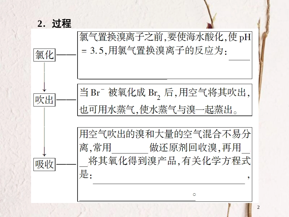 海水提溴1.原理(吹出法)从海水中提取的溴约占世界溴年产量的1/3。常用的方法叫空气吹出法,反应原理为,然后用空气或水蒸气吹出溴蒸气。Cl2...