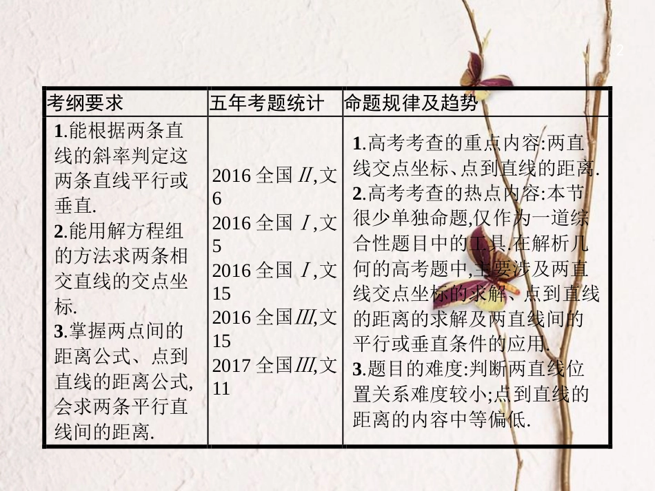 9.2点与直线、两条直线的位置关系1考纲要求五年考题统计命题规律及趋势1.能根据两条直线的斜率判定这两条直线平行或垂直.2.能用解方程组的...
