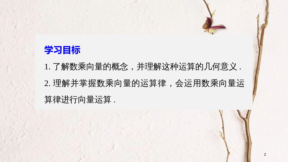 2.1.4数乘向量第二章§2.1向量的线性运算1学习目标1.了解数乘向量的概念,并理解这种运算的几何意义.2.理解并掌握数乘向量的运算律,会运用...