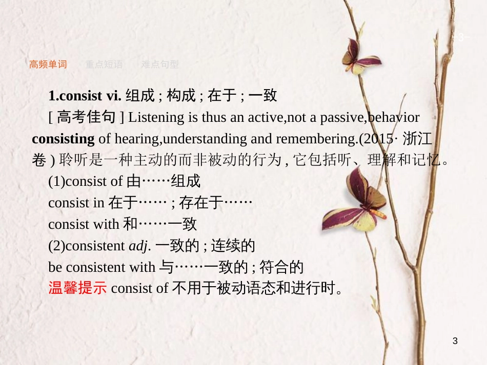 Unit2TheUnitedKingdom1-2-主题语境:人与自然——主要国家地理概况2-3-高频单词重点短语难点句型1.consistvi.组成;构成;在于;一致[高考佳句...