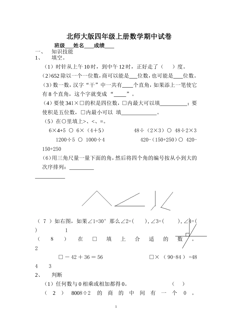 北师大版四年级上册数学期中试卷班级姓名成绩一、知识技能1、填空。(1)时针从上午10时,到中午12时,正好走了()度。(2)652除以一个一...