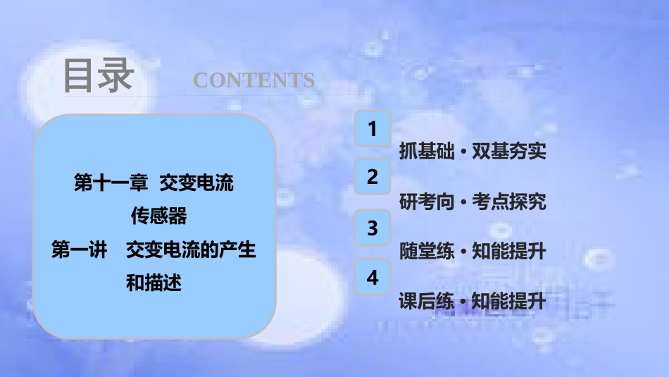 4抓基础·双基夯实2研考向·考点探究3随堂练·知能提升课后练·知能提升目录CONTENTS1第十一章交变电流传感器第一讲交变电流的产生和描述考...