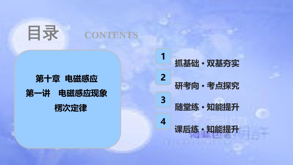 4抓基础·双基夯实2研考向·考点探究3随堂练·知能提升课后练·知能提升目录CONTENTS1第十章电磁感应第一讲电磁感应现象楞次定律考点内容要...