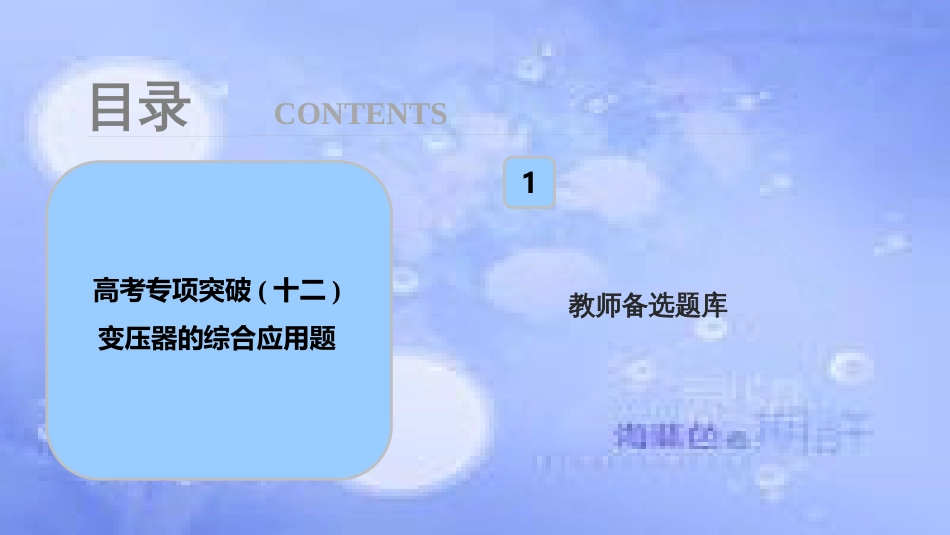 目录CONTENTS高考专项突破(十二)变压器的综合应用题教师备选题库1[真题1](多选)(2016·高考全国卷Ⅲ)如图,M为半圆形导线框,圆心为OM;N是...