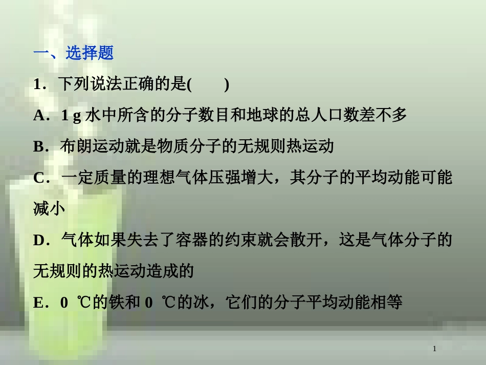 一、选择题1.下列说法正确的是()A.1g水中所含的分子数目和地球的总人口数差不多B.布朗运动就是物质分子的无规则热运动C.一定质量的理想...