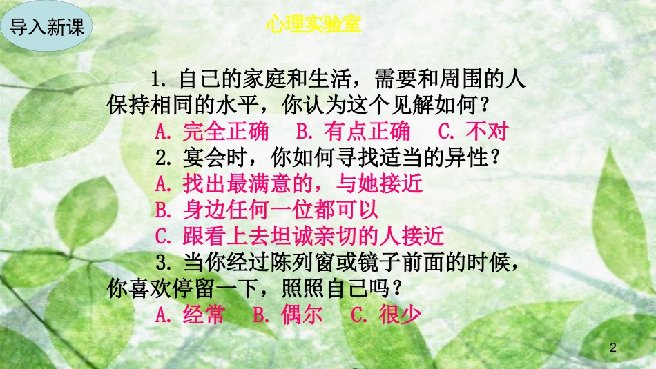 20创造宣言陶行知1导入新课心理实验室1.自己的家庭和生活,需要和周围的人保持相同的水平,你认为这个见解如何?A.完全正确B.有点正确C.不...