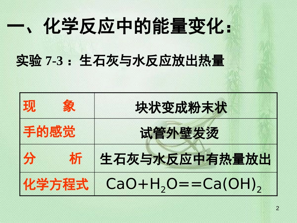 课题2燃料的合理应用与开发第七单元燃料及其利用1一、化学反应中的能量变化:现象手的感觉分析化学方程式块状变成粉末状试管外壁发烫生石灰...