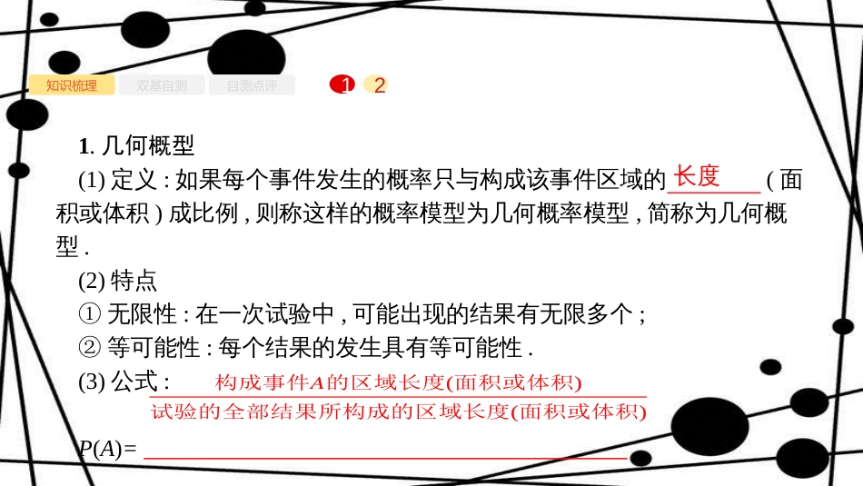 11.3几何概型1知识梳理双基自测21自测点评1.几何概型(1)定义:如果每个事件发生的概率只与构成该事件区域的(面积或体积)成比例,则称这样的概...