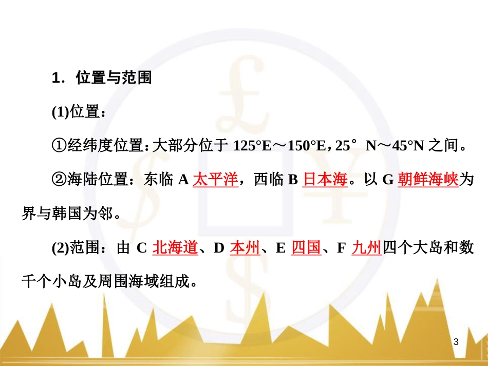 第十八章世界地理学案44世界重要国家第四部分区域地理1考点一日本21.位置与范围(1)位置:①经纬度位置:大部分位于125°E~150°E,25°N...