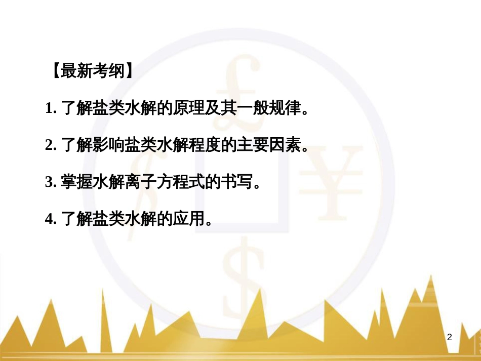 第3讲盐类的水解1【最新考纲】1.了解盐类水解的原理及其一般规律。2.了解影响盐类水解程度的主要因素。3.掌握水解离子方程式的书写。4.了解...