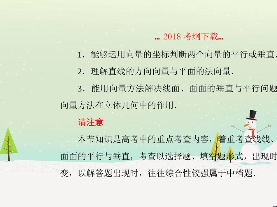 第7课时空间向量的应用(一)平行与直…2018考纲下载…1.能够运用向量的坐标判断两个向量的平行或垂直.2.理解直线的方向向量与平面的法向...