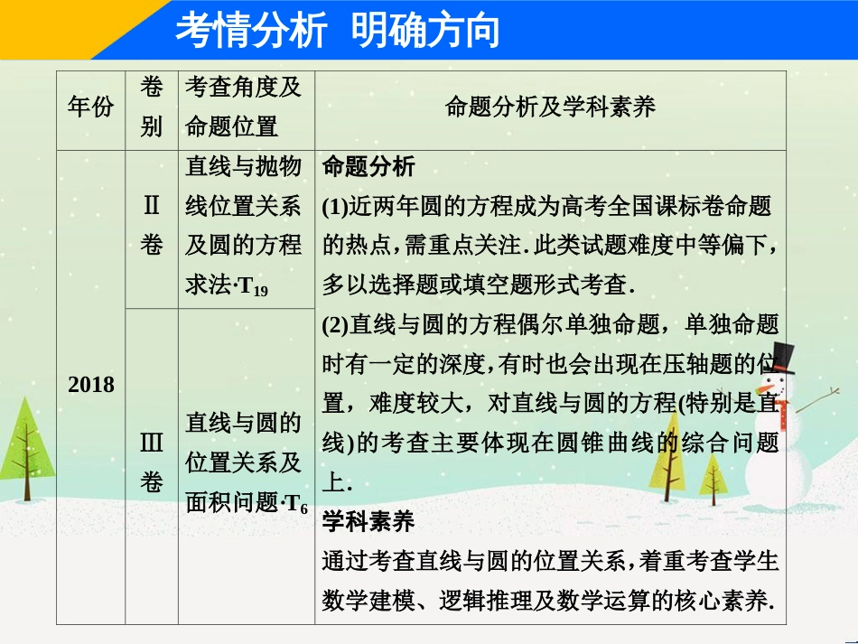 专题五解析几何第一讲直线与圆考点二考点三考点一目录ONTENTSC4课后训练提升能力考情分析明确方向年份卷别考查角度及命题位置命题分析及学...