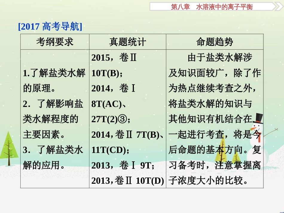 第三讲盐类的水解第八章水溶液中的离子平衡[2017高考导航]考纲要求真题统计命题趋势1.了解盐类水解的原理。2.了解影响盐类水解程度的主要...
