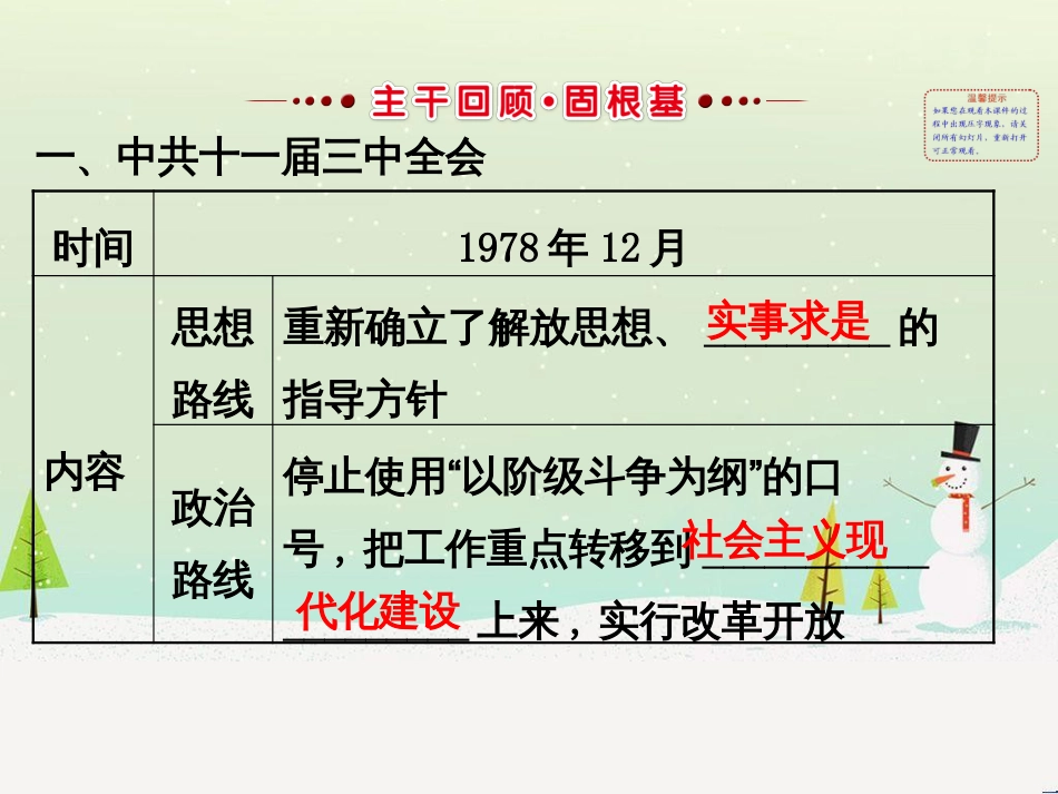第17讲伟大的历史性转折及走向社会主义现代化建设新阶段一、中共十一届三中全会时间1978年12月内容思想路线重新确立了解放思想、_________...
