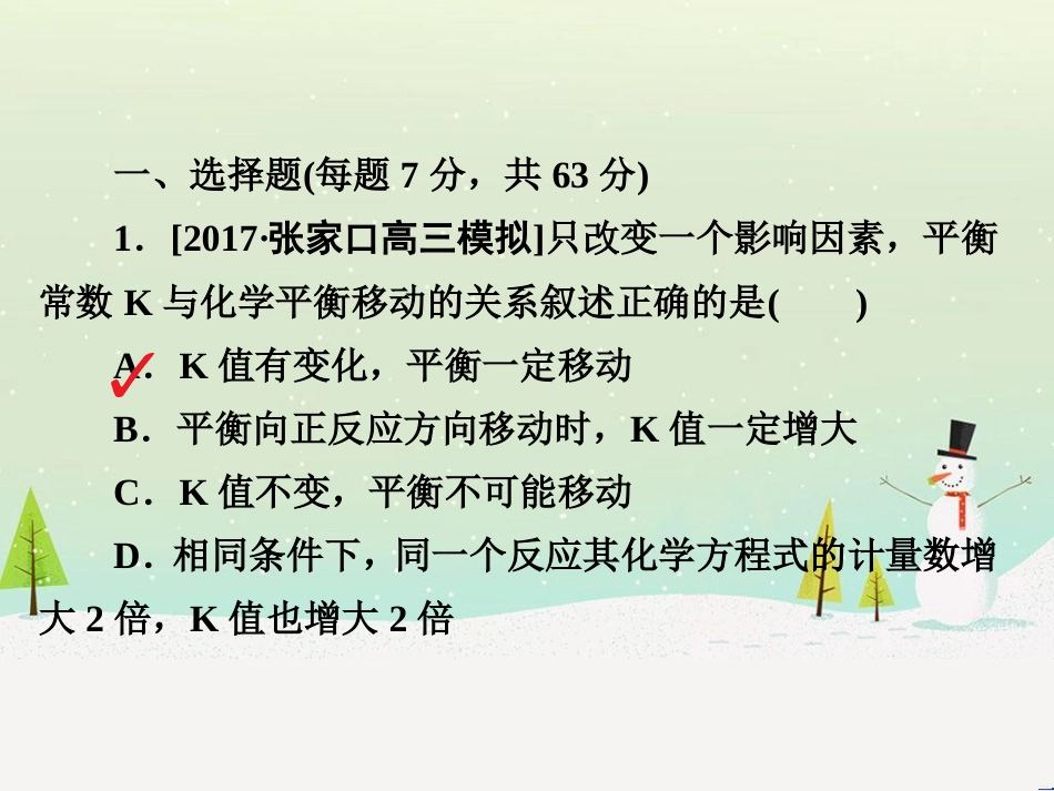 板块三限时·规范·特训时间:45分钟满分:100分一、选择题(每题7分,共63分)1.[2017·张家口高三模拟]只改变一个影响因素,平衡常数K与化...