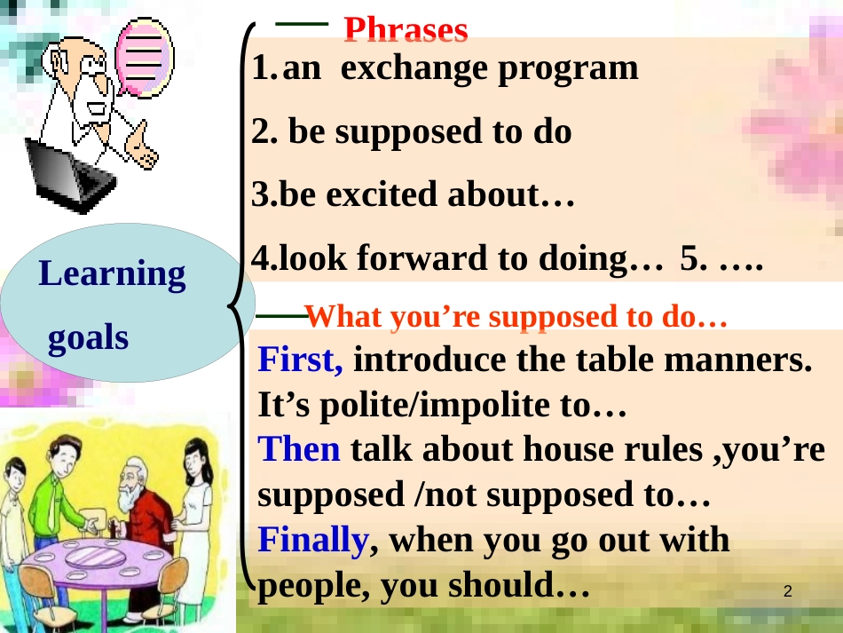 Period61LearninggoalsPhrasesWhatyou’resupposedtodo…1.anexchangeprogram2.besupposedtodo3.beexcitedabout…4.lookforwardtodoing…5....