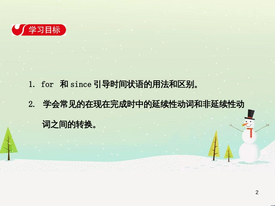 SectionA(GrammarFocus~4c)11.for和since引导时间状语的用法和区别。2.学会常见的在现在完成时中的延续性动词和非延续性动词之间的转换。2...