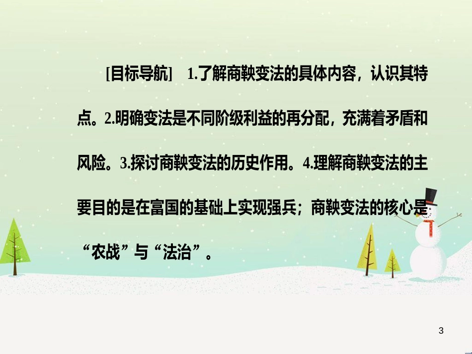 第二单元古代历史上的改革(下)1第4课商鞅变法与秦的强盛2[目标导航]1.了解商鞅变法的具体内容,认识其特点。2.明确变法是不同阶级利益的...