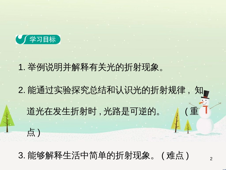 第三章光和眼睛第4节探究光的折射规律11.举例说明并解释有关光的折射现象。2.能通过实验探究总结和认识光的折射规律,知道光在发生折射时,光...