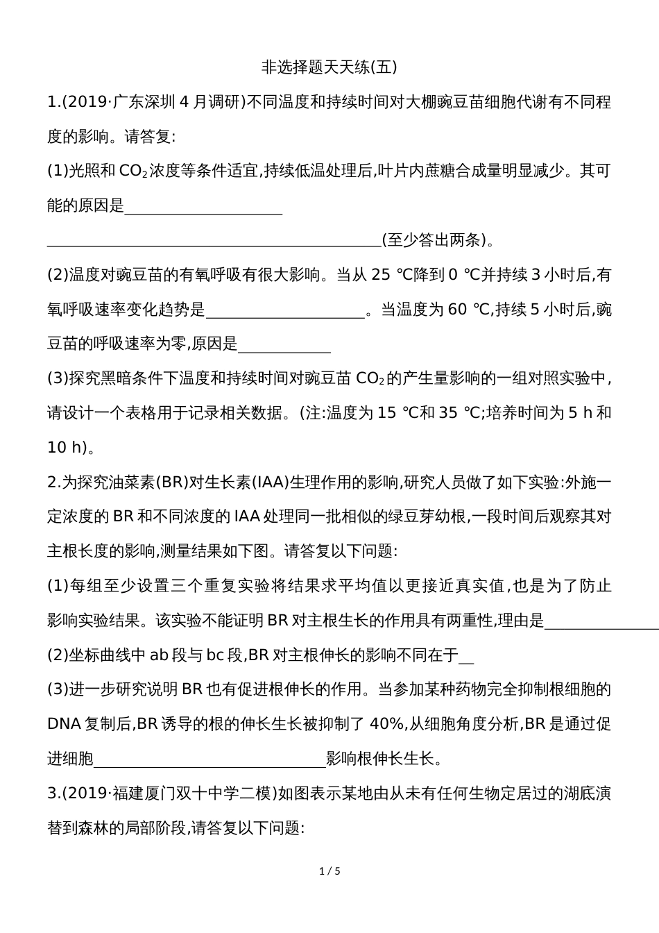 非选择题天天练(五)1.(2019·广东深圳4月调研)不同温度和持续时间对大棚豌豆苗细胞代谢有不同程度的影响。请答复:(1)光照和CO2浓度等条件适...