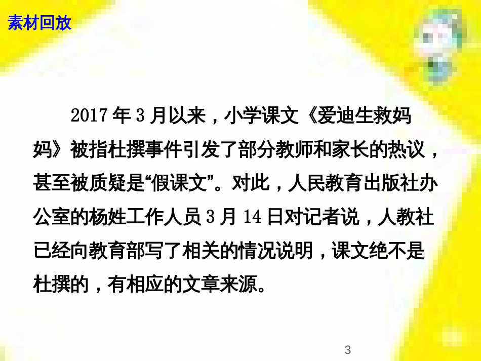 “假课文”里如何学到“真知识”?12素材回放2017年3月以来,小学课文《爱迪生救妈妈》被指杜撰事件引发了部分教师和家长的热议,甚至被质...