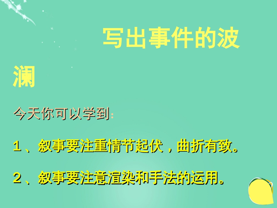 请请把心静下来,把心静下来,让我们一同走进写作的殿堂……让我们一同走进写作的殿堂……写出事件的波澜今天你可以学到今天你可以学到:11...