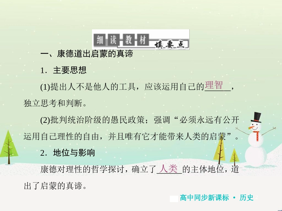 高中同步新课标·历史第4课理性之光与浪漫之声课程标准:简述卢梭、康德等启蒙思想家的观点,概括启蒙运动对人文主义思想的发展。1高中同步...