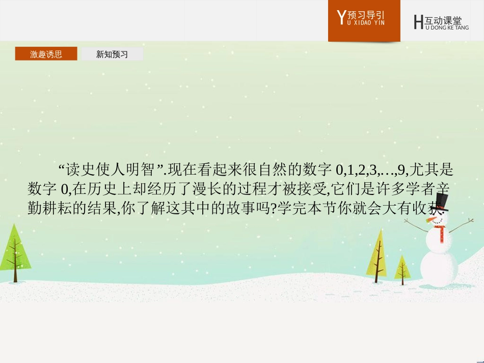 第二章数与符号§1数的表示与十进制YUXIDAOYIN预习导引HUDONGKETANG互动课堂激趣诱思新知预习“读史使人明智”.现在看起来很自然的数字0,1,...
