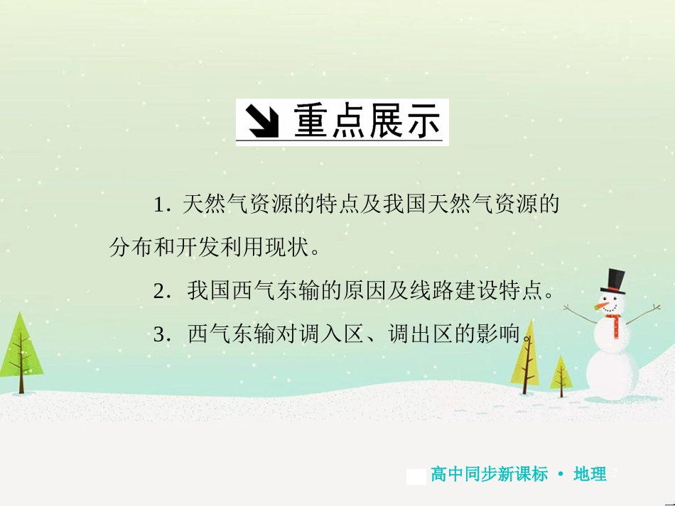 高中同步新课标·地理第一节资源的跨区域调配——以我国西气东输为例1高中同步新课标·地理1.天然气资源的特点及我国天然气资源的分布和开...