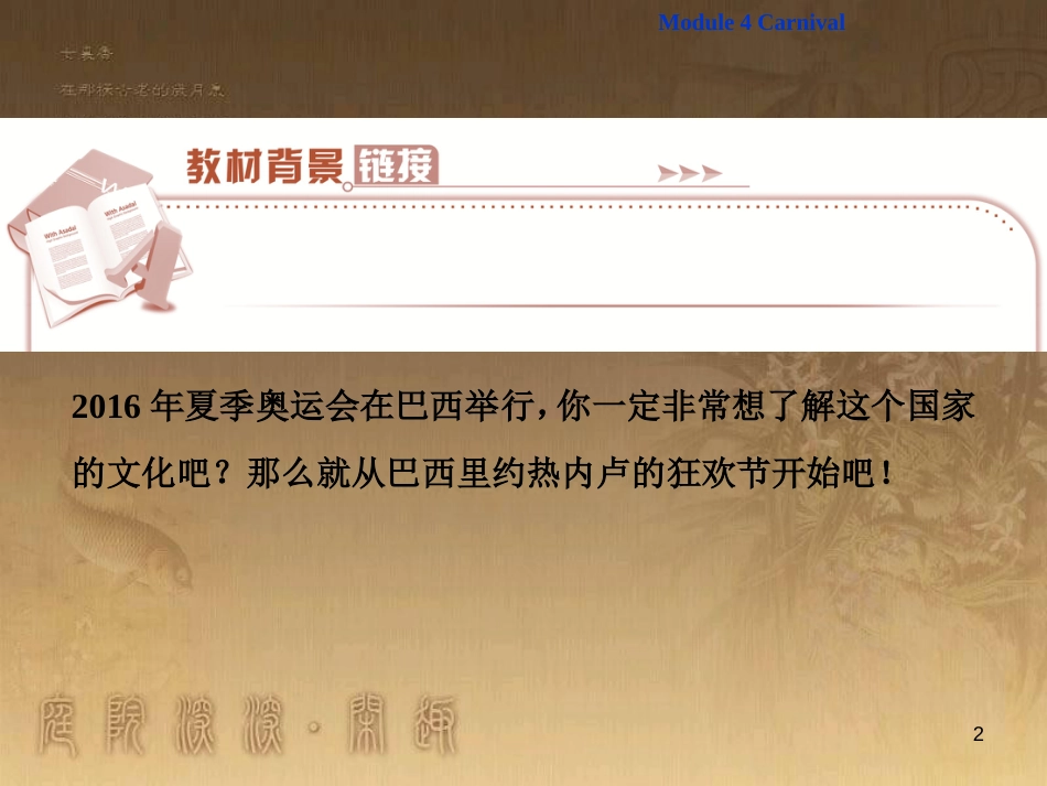 12016年夏季奥运会在巴西举行,你一定非常想了解这个国家的文化吧?那么就从巴西里约热内卢的狂欢节开始吧!Module4Carnival2TheannualCarn...