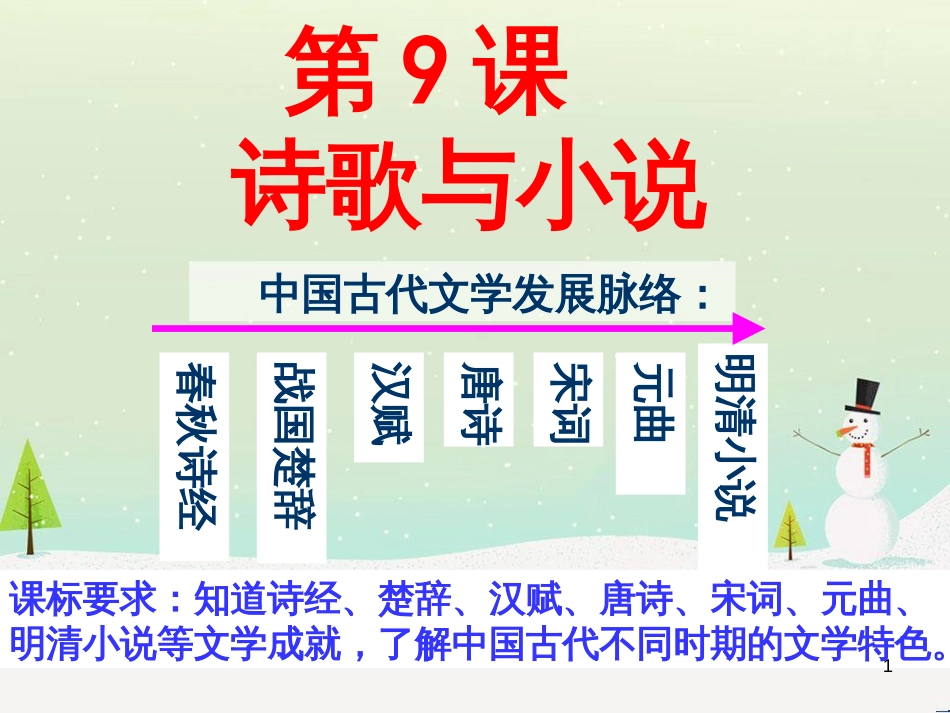 中国古代文学发展脉络:元曲春秋诗经战国楚辞汉赋唐诗宋词明清小说第9课诗歌与小说课标要求:知道诗经、楚辞、汉赋、唐诗、宋词、元曲、明...