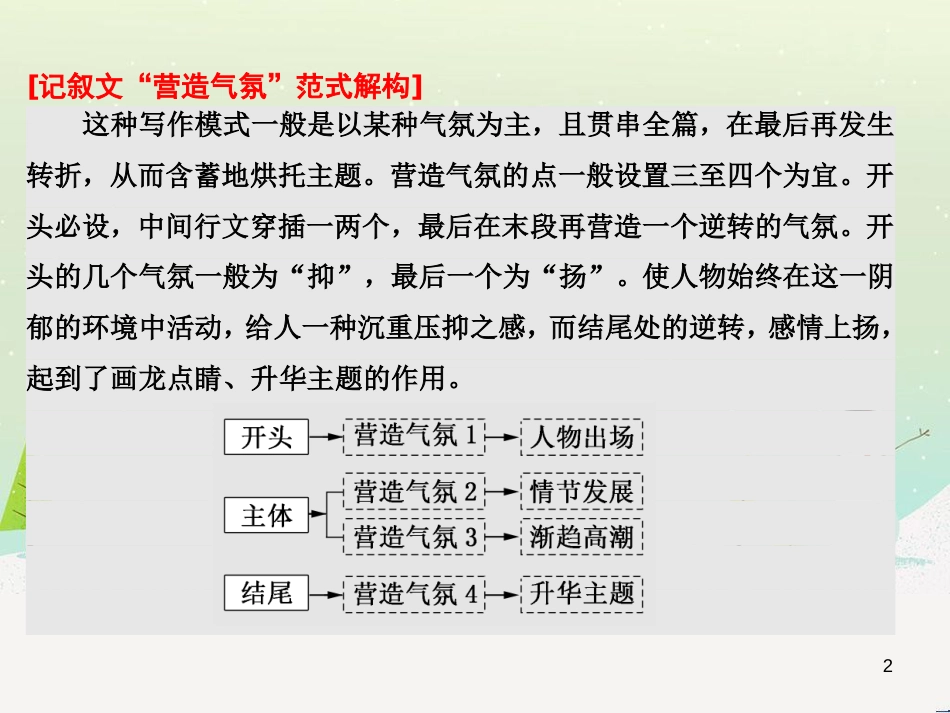 1[记叙文“营造气氛”范式解构]这种写作模式一般是以某种气氛为主,且贯串全篇,在最后再发生转折,从而含蓄地烘托主题。营造气氛的点一般...