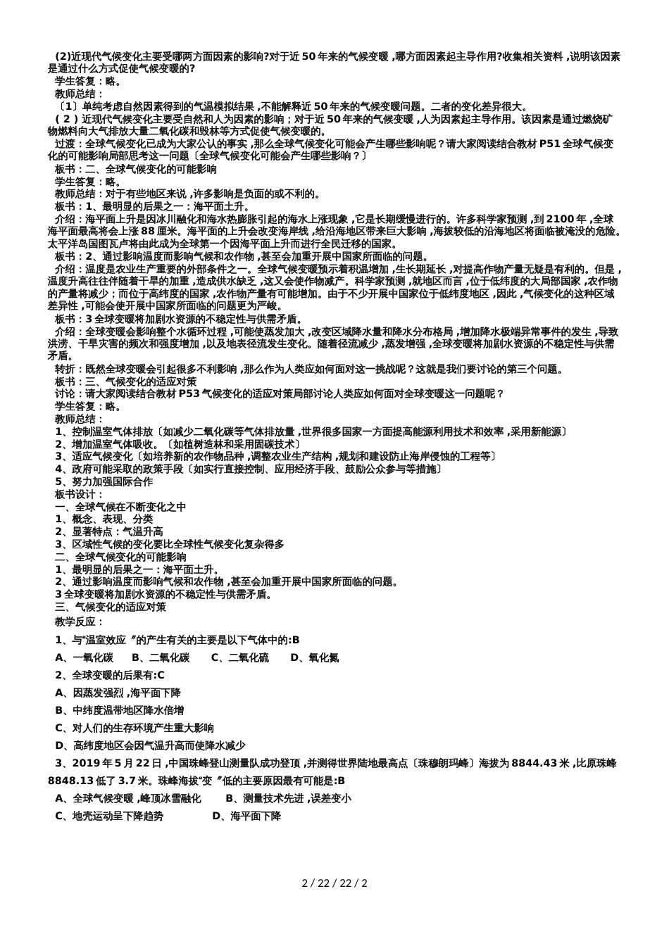 第二章地球上的大气第四节全球气候变化课标要求:根椐有关资料,说明全球气候变化对人类活动的影响。教材分析:从标准的要求看,学习的重点不...