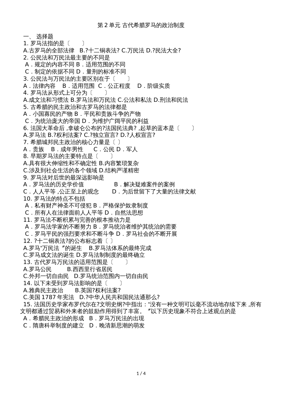 第2单元古代希腊罗马的政治制度一、选择题1.罗马法指的是〔〕A.古罗马的全部法律B.?十二铜表法?C.万民法D.?民法大全?2.公民法和万民法最主...