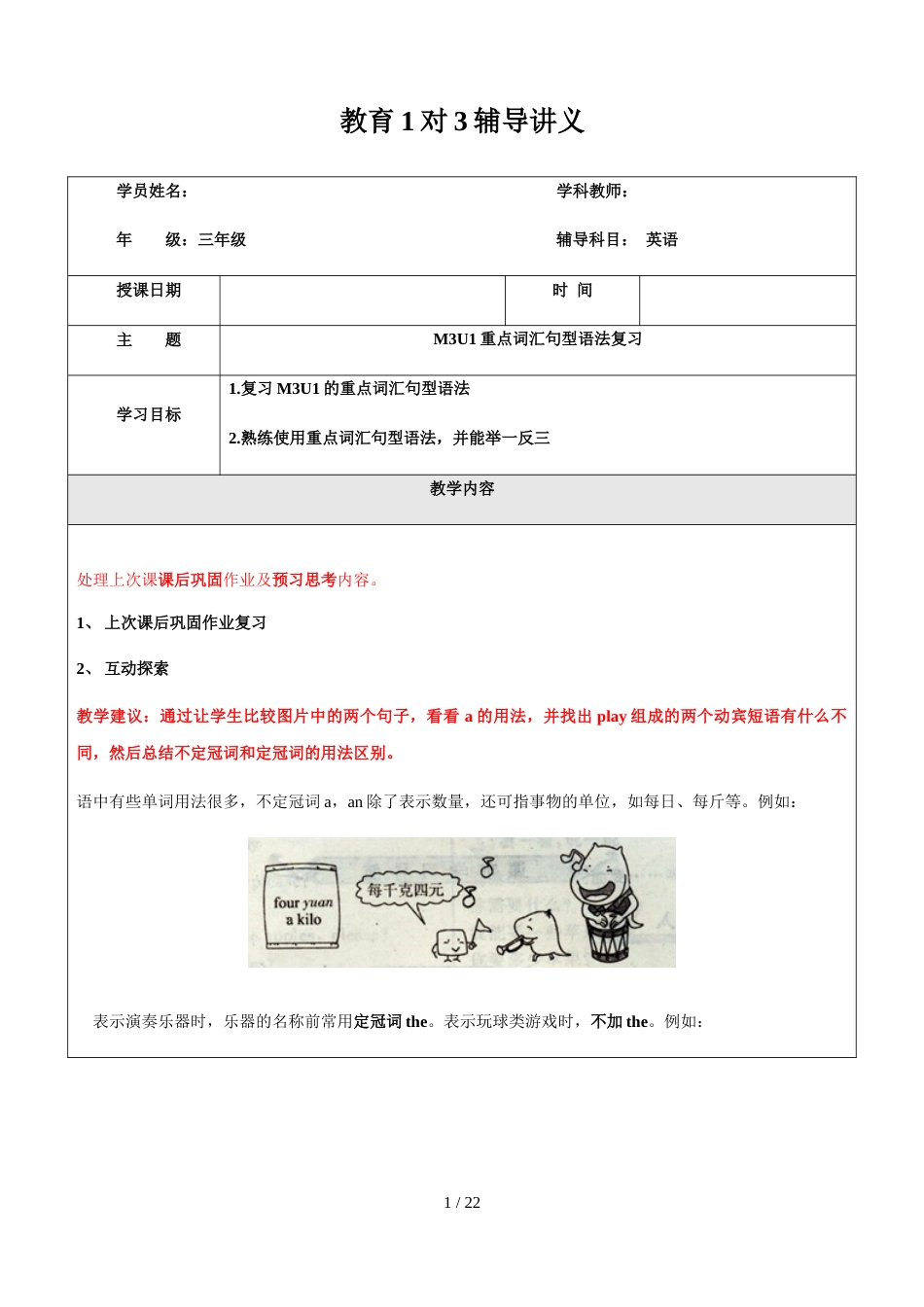教育1对3辅导讲义学员姓名:学科教师:年级:三年级辅导科目:英语授课日期时间主题M3U1重点词汇句型语法复习学习目标1.复习M3U1的重点词汇...